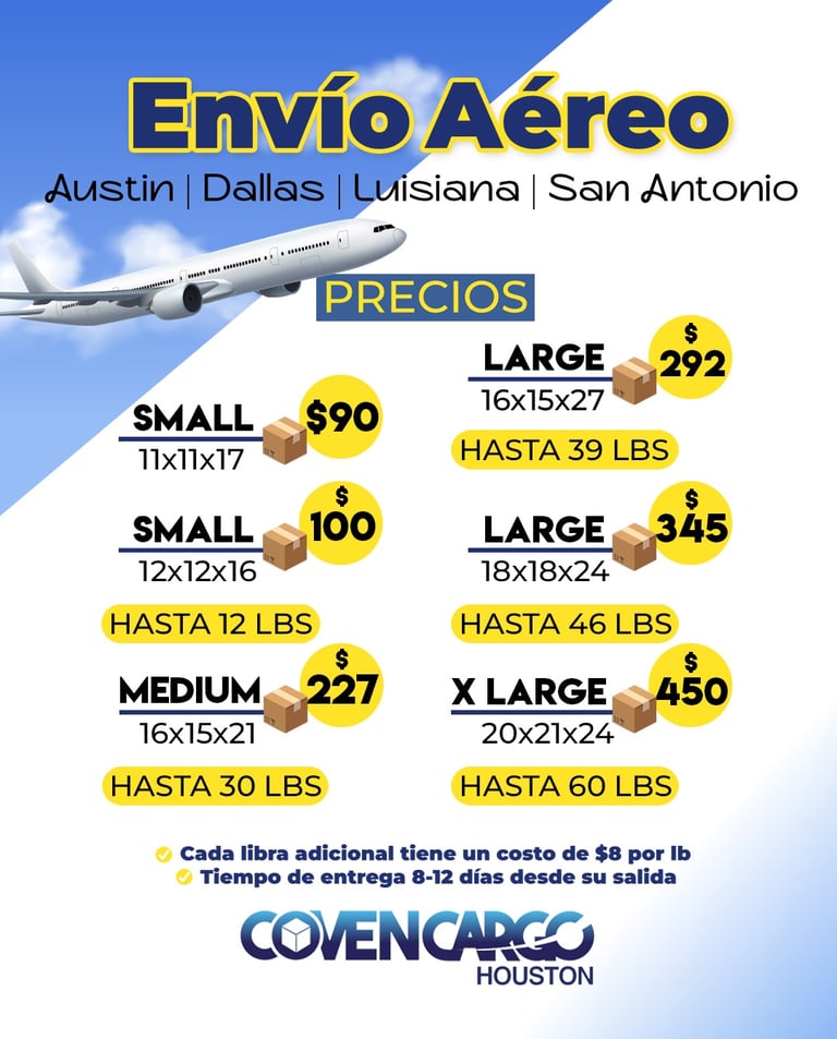 Con entrega en 10 - 15 días y recogida puerta a puerta. Olvídate de demoras marítimas: disfruta de la rapidez del aire, con un costo extra de US $ 6.50/lb para excedentes. ¡Más volumen, menos espera!