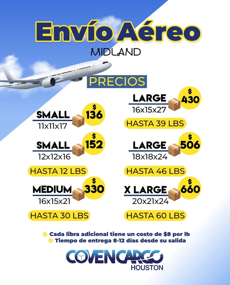 Con entrega en 10 - 15 días y recogida puerta a puerta. Olvídate de demoras marítimas: disfruta de la rapidez del aire, con un costo extra de US $ 6.50/lb para excedentes. ¡Más volumen, menos espera!