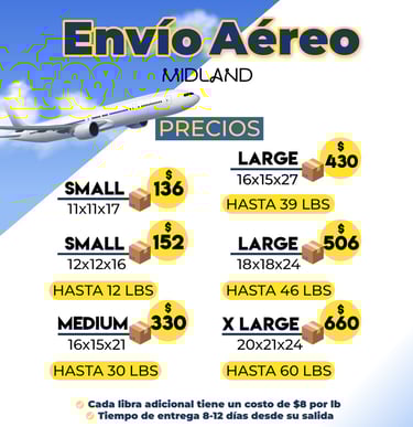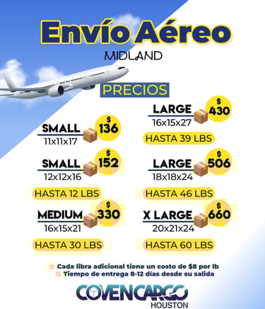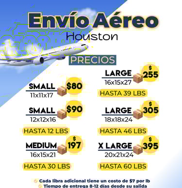 Para mercancías urgentes, disponemos de envíos aéreos con una entrega rápida de 10 a 12 días hábiles. Nuestras tarifas son fijas por caja Small, Mediana y Large, o por caja irregular y libra suelta. Así, tu carga vuela con total seguridad y llega a su destino sin demoras.