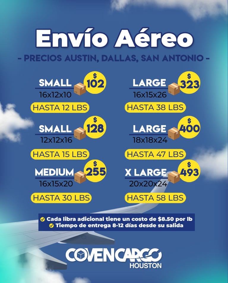Nuestras tarifas son fijas por caja Small, Mediana y Large, o por caja irregular y libra suelta. Así, tu carga vuela con total seguridad y llega a su destino sin demoras.