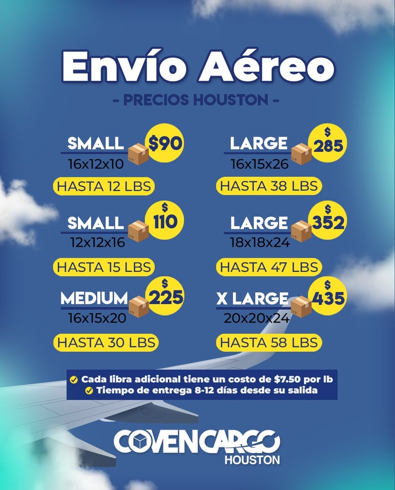 Nuestras tarifas son fijas por caja Small, Mediana y Large, o por caja irregular y libra suelta. Así, tu carga vuela con total seguridad y llega a su destino sin demoras.